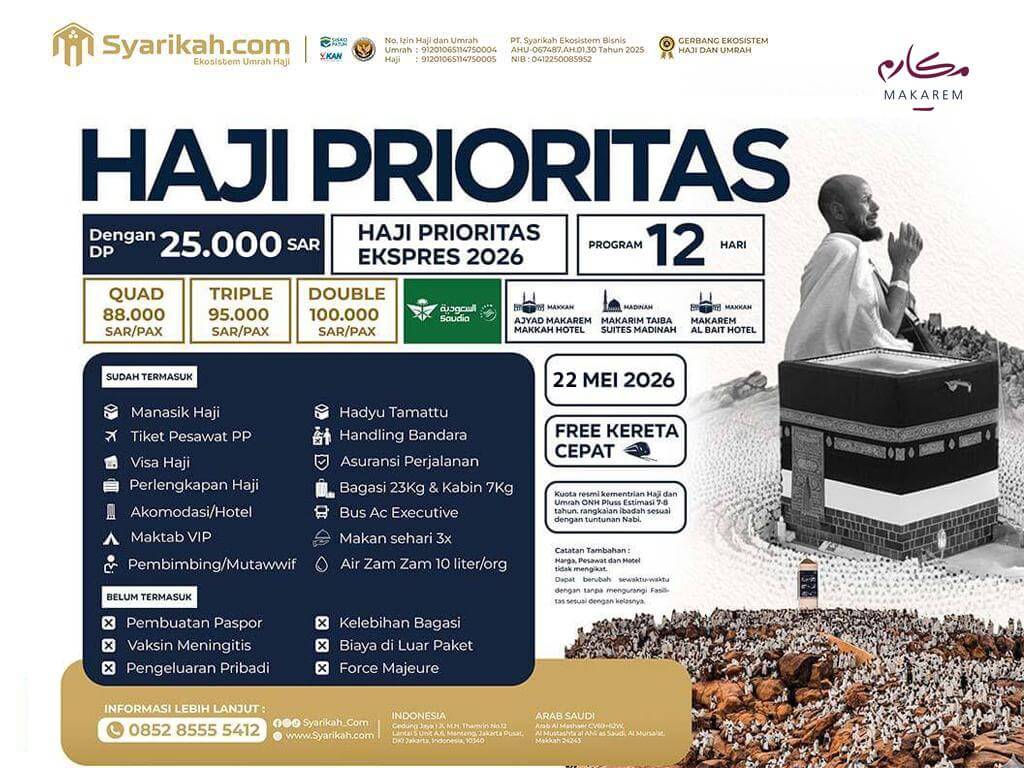 - Jika jama’ah telah melunasi biaya paket Haji Prioritas maka jamaah berhak mendapatkan fasilitas dan akomodasi (terlampir pada setiap penawaran produk) yang sesuai dengan paket yang dipilih dan disetujui di awal pendaftaran.